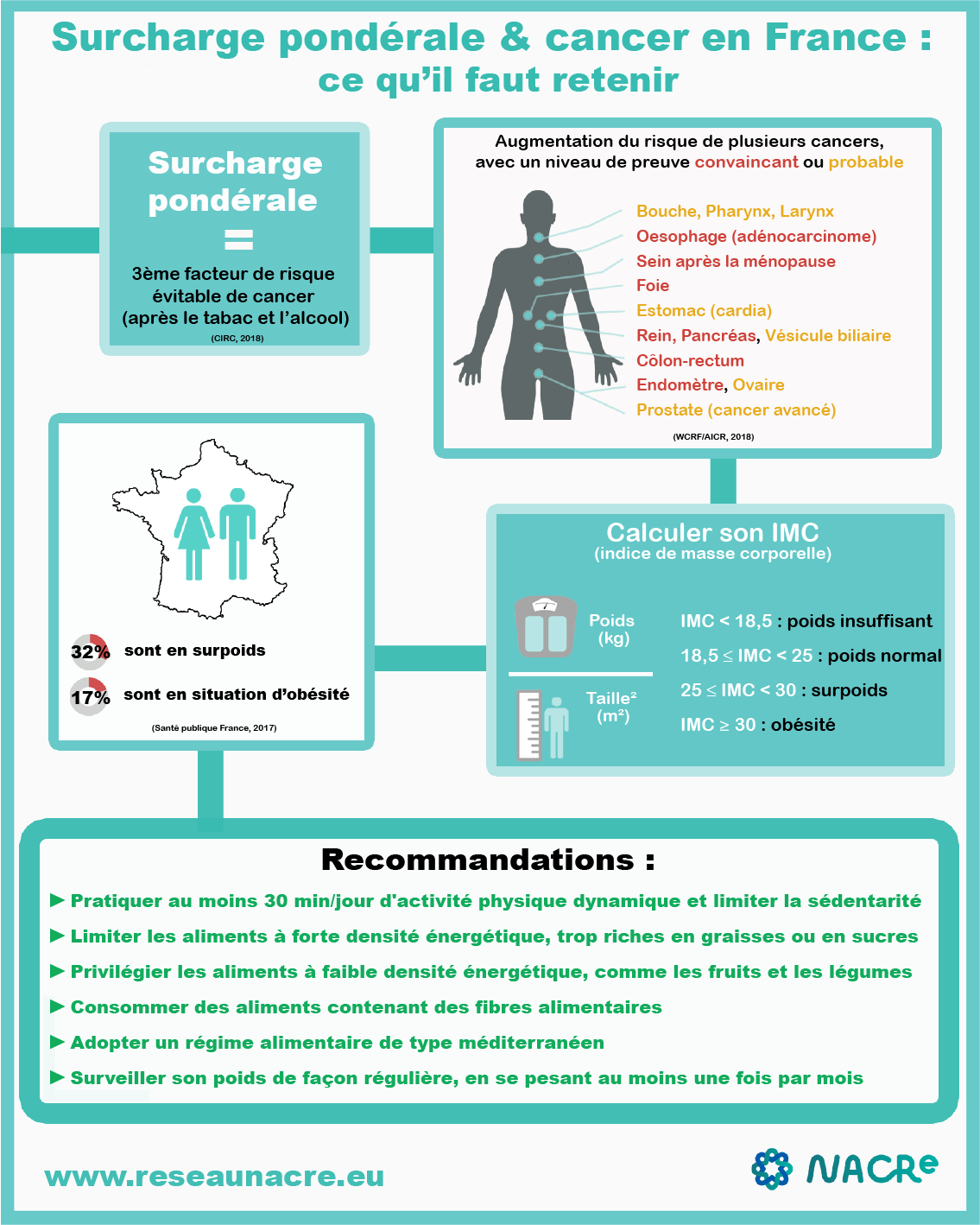 Le rapport de 2018 du Centre International de Recherche sur le Cancer (CIRC) sur « Les cancers attribuables au mode de vie et à l’environnement en France métropolitaine » a estimé qu’en France, chez les personnes âgées de 30 ans et plus, sur les 346 000 nouveaux cas de cancer de l’année 2015, 18 600 étaient attribuables au surpoids et à l’obésité (notamment 4 500 cancers du sein et 4 400 cancers colorectaux) soit 5,4 % des nouveaux cas de cancer (6,8 % chez les femmes et 4,2 % chez les hommes). La surcharge pondérale est ainsi le troisième facteur de risque évitable de cancer derrière le tabac et l’alcool [1].